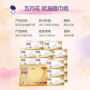 五月花(May Flower) 抽纸 婴儿柔抽取式面巾纸 3层120抽20包 (整箱销售)*1箱