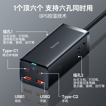 倍思 氮化镓桌面插线板 2AC+2U+2C 100W 中规 黑(含:小白系列 快充数据线Type-C To Type-C 100W(20V/5A)1m 黑色)*1