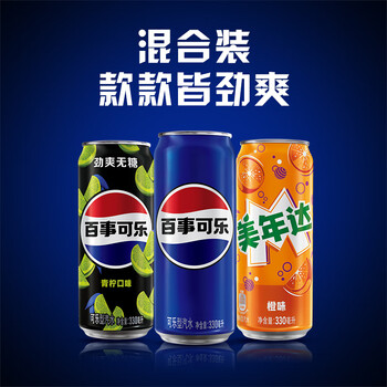 百事可乐Pepsi 可乐*12+美年达*6+无糖青柠*6 碳酸饮料 汽水330ml 混合装