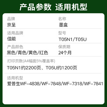 京呈N1&U2+U3+U4 四色套装墨盒适用爱普生WF-4838 WF-7848 WF-7318打印机机型墨粉盒墨水盒