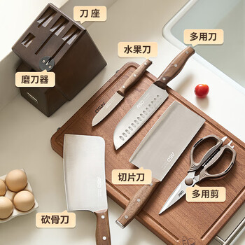 砍骨刀*1、切片刀*1、小厨刀*1、水果刀*1、 外置磨刀器*1、剪刀*1、木座*1、说明书*1、刀盒*1、衬板*3