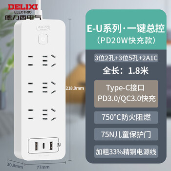 德力西(DELIXI) 20W PD快充插座/插线板/插排 Type-c口+USB口+6插孔全长1.8米 总控开关