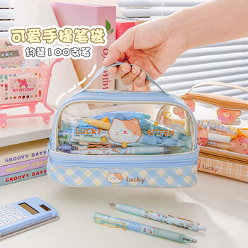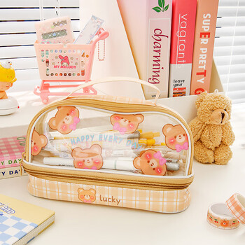 三年二班 可爱小猫兔大容量透明笔袋 小学生初高中高颜值文具盒多功能带分类文具袋 黄色小熊