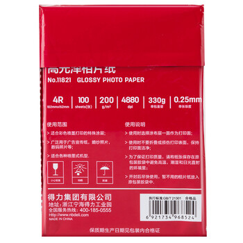 得力(deli)11821 6寸高光照片纸相片纸 彩色喷墨打印纸 4R-200g (100张/盒)1盒装