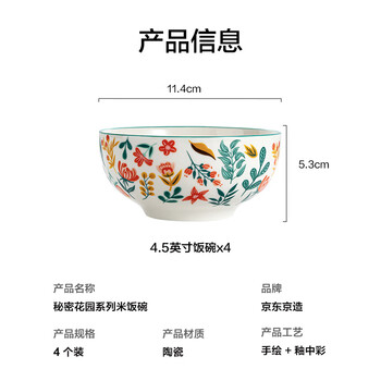 京东京造美式碗 汤面碗陶瓷蒸鸡蛋羹沙拉家用 秘密花园 饭碗4.5英寸*4