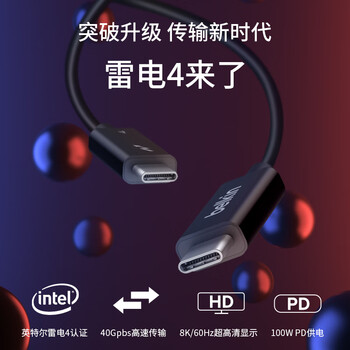 贝尔金(BELKIN)雷电4数据线 英特尔认证 PD快充100W Type-C公对公视频传输 充电线 2米主动式 INZ002