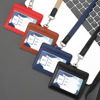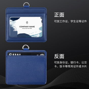 嘉然恒 真皮工作牌企业员工胸牌证件卡套带收纳卡位挂脖牌会议出入证工作证套牛皮材质可定制 蓝色横款