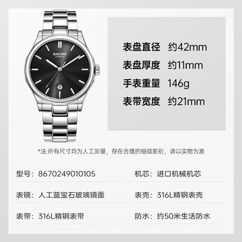 雷诺(RARONE)男士手表机械表防水日历全自动腕表钢带商务出差 生日礼物送老公