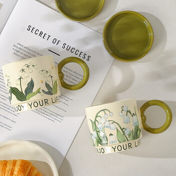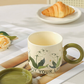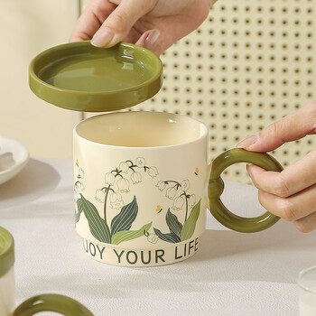 传旗陶瓷马克杯带盖咖啡杯牛奶杯早餐杯子办公杯男女茶杯 铃兰花400ml