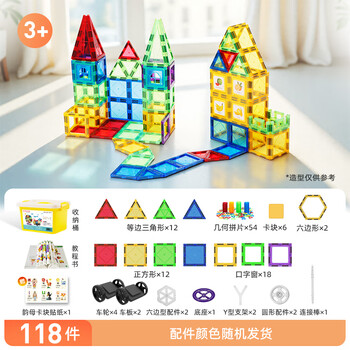 新组合:三角形x12 正方形x12 口字正方形x18 六边形x2 摩天轮组件x8 韵母卡块x6 车板x2 车轮x4 几何拼片x54 手册x1 收纳桶x1