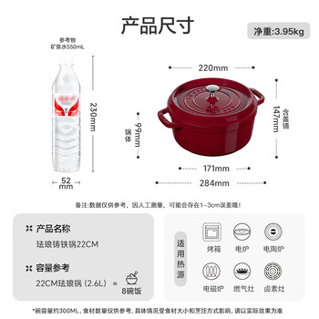 珐宝(staub)厨房好物法国进口珐琅铸铁锅酒红22cm双耳煲汤锅 40502-293