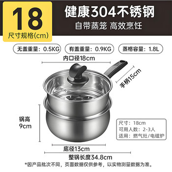 炊大皇304不锈钢奶锅+蒸屉辅食锅汤锅婴儿宝宝煮牛奶热奶锅泡面锅18cm