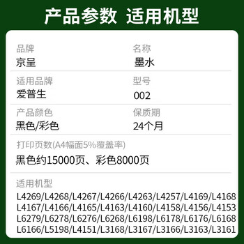京呈适用爱普生002墨水L4266 L4168 L4268 L4166 L4269 4158 4160 4168 4267 6178 epson打印机墨水 四色套装