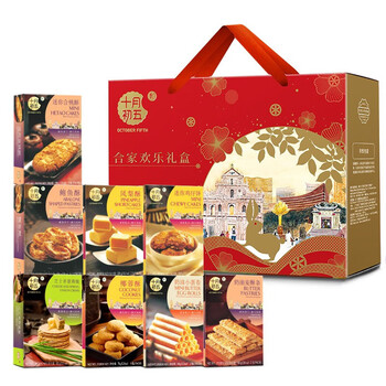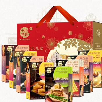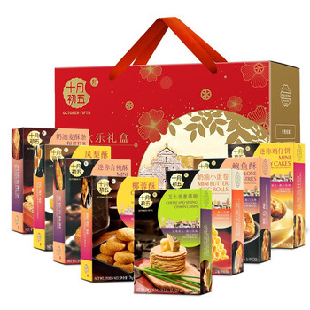 1、十月初五62g奶油小蛋卷X1盒 2、十月初五108g迷你合桃酥X1盒 3、十月初五78g椰蓉酥X1盒 4、十月初五108g鲍鱼酥X1盒 5、十月初五100g迷你鸡仔饼X1盒 6、十月初五120g凤梨酥X1盒 7、十月初五80g奶油麦酥条X1盒 8、十月初五65g芝士香葱薄脆X1盒