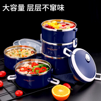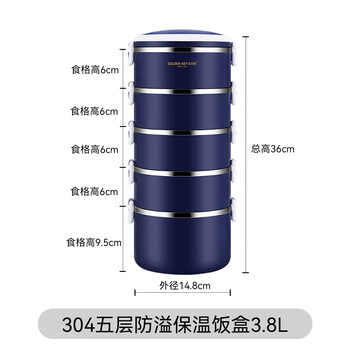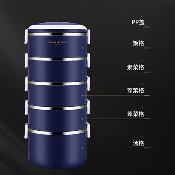 金钥匙(GOLDEN KEY)304不锈钢五层防溢保温饭盒多层组合便当盒3.8L尊贵蓝GK-3800BD-L