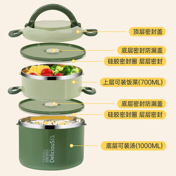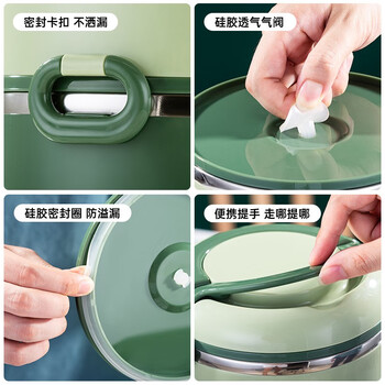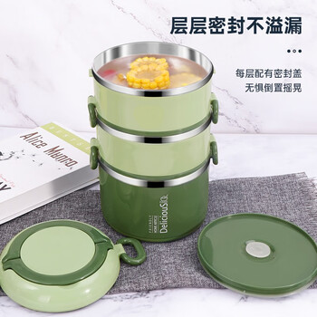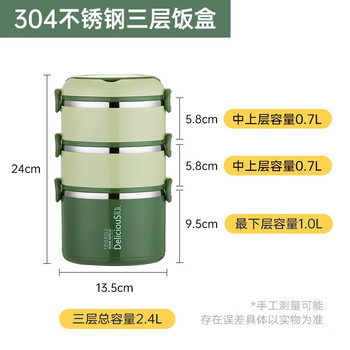贝瑟斯304不锈钢饭盒三层大容量保温饭盒便携手提饭桶2.4L绿 上班族餐盒