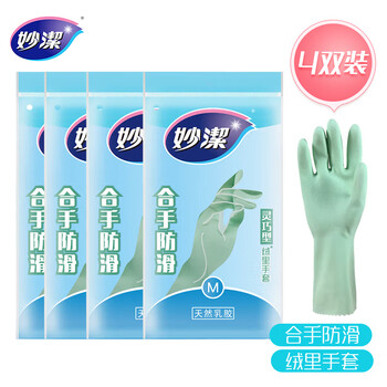 妙洁灵巧型乳胶手套 4双 中号 喷绒内里 防水防滑皮 厨房洗碗洗衣