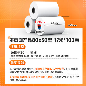 天章 (TANGO)80*50mm17米*100卷 新橙热敏收银纸 京东外卖餐饮后厨小票纸 商超收银凭证打印纸 适配80mm机器