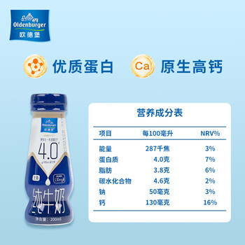 欧德堡(Oldenburger)4.0g蛋白高钙 全脂纯牛奶200ml*24盒 京东自营 早餐奶