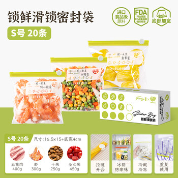 品牌: Easy Your Home/易优家 品名:易优家食品级锁鲜密实袋 货号:锁鲜S号 原料:进口食品级聚乙烯(PE) 规格:165×150×0.045mm 数量:20条 使用场景:常温 冷藏 冷冻 使用温度:-20℃至100℃