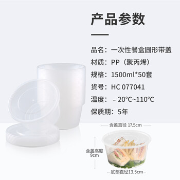 美丽雅一次性饭盒圆形1500ml*50套打包碗加厚餐盒带盖可微波大容量