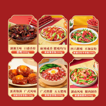 新如意香肠200g/腊鸭500g/新湖南腊肉200g/团圆香饼150g/麻辣香肠200g/新湘式牡丹香肠200g