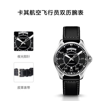 汉米尔顿(Hamilton)汉密尔顿卡其航空飞行员双历42黑盘皮带瑞士手表男士机械表礼物