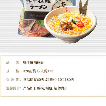 味千拉面麻辣拉面320g*3/袋6人份含料包挂面 早餐面食 冷藏面条开学季
