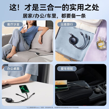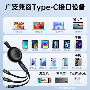 倍思Type-C数据线三合一伸缩线PD100W5A快充一拖三适用苹果17/16/15/14小米华为mate70手机平板车载 黑