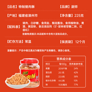 厨師 特制猪肉酥225g 高蛋白猪肉松美味搭档休闲零食下饭菜烘焙食材
