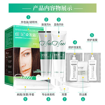 染发剂*1、显色剂*1、洗发露*1、发膜*1,防沾素*1、染梳*1、手套*1、肩围*1、发罩*1、耳套*1、说明书*1