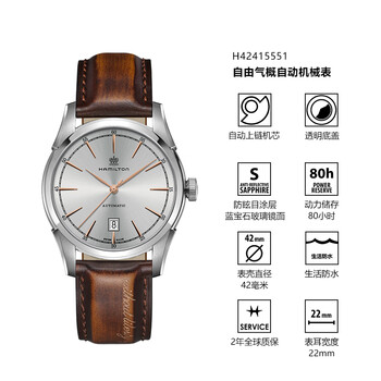 汉米尔顿(Hamilton)经典自由气概42银盘皮带全自动机械表男瑞士手表商务表男士礼物