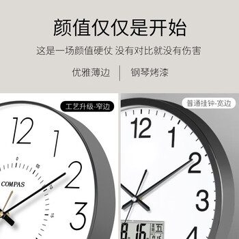 康巴丝(Compas)挂钟客厅钟表 万年历挂墙时钟 自动对时电波钟 D6219AY黑色 35cm