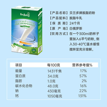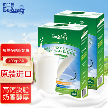 贝兰多 脱脂奶粉400g*2盒 白俄罗斯原装进口高蛋白营养早餐中老年牛奶粉