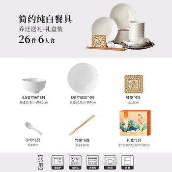传旗 碗盘餐具套装 26头纯白礼盒碗碟套装 适用3-6人