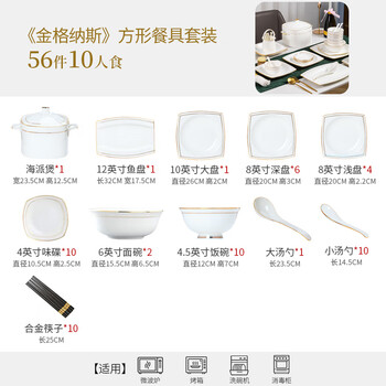 饭碗*10,面碗*2,8英寸方形深盘*6,8英寸方形浅盘*4,方形鱼盘*1,方形大盘*1,海派煲*1,方形味碟*10,小勺*10,大勺*1,筷子*10