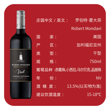 蒙大菲(ROBERT MONDAVI)私家精选赤霞珠干红葡萄酒 美国 750ml 单瓶 热门商品