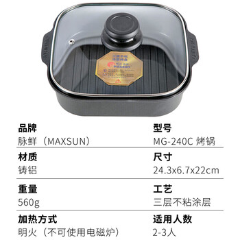 脉鲜卡式炉便携多功能煎烤锅MG-240C 汤锅 3层不沾煎烤盘 带盖子24cm
