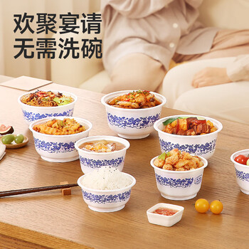 美丽雅一次性碗青花餐盒700ml*20只 大号食品级塑料野餐饭碗耐高温泡面