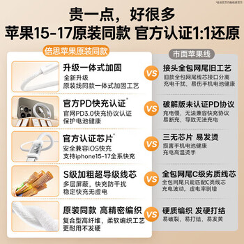 倍思双头Type-C充电线PD100W/88W超级快充数据线适用苹果17/16/15华为荣耀小米手机iPad笔记本 1米白