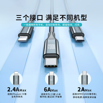 罗马仕 数据线三合一充电线6A快充100W充电器线一拖三头适用苹果Type-c安卓iPhone16/15小米华为手机车载