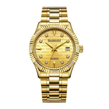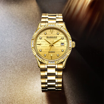 罗西尼(ROSSINI)男士手表机械表金色盘钢带生日礼物送男友国表锆钻日历防水 6705