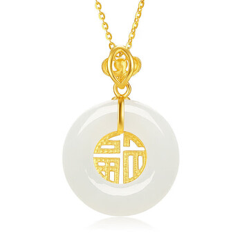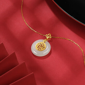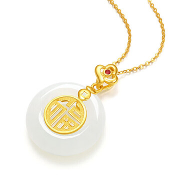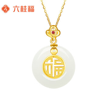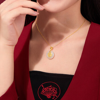 六桂福珠宝 黄金吊坠 福字 足金镶玉挂坠项链女 HT0600019配银链 1.7g