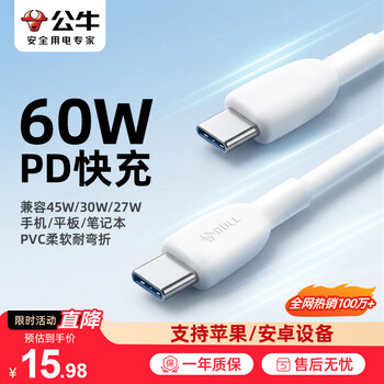公牛(BULL)双头Type-C数据线PD60W超级快充适用华为荣耀小米苹果17/16e/15平板iPad笔记本电脑车载1米