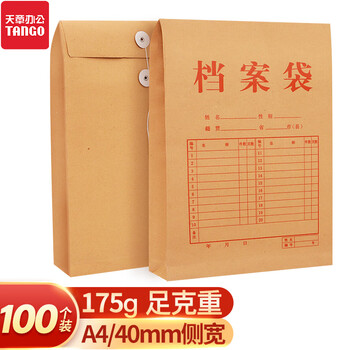 天章 (TANGO)a4皮纸档案袋100只175g侧宽40mm文件袋A4资料袋合同标书人事办公室收纳袋可定制 T19574办公用品