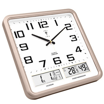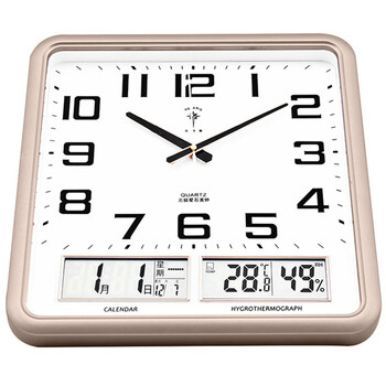 北极星 挂钟14英寸万年历温湿度计创意客厅日历挂表钟表金黄双液晶