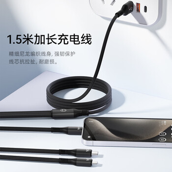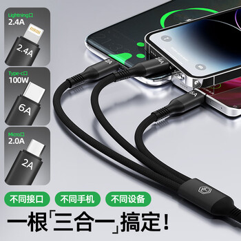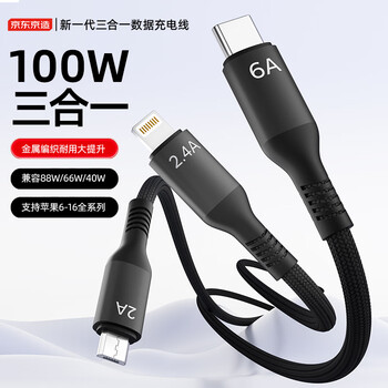 京东京造三合一充电线100W/88W/66W快充数据线一拖三头Type-C适用于安卓iPhone苹果华为小米手机车载编织线