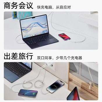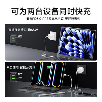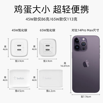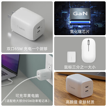 贝尔金(BELKIN)苹果充电器 65W氮化镓充电器 双口Type-C快充 苹果iPhone17macbook充电头 便携 WCH013