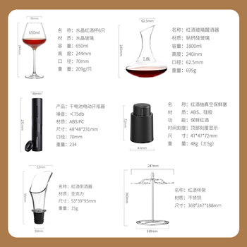 红酒杯*6 醒酒器*1 开瓶器*1 红酒塞*1 倒酒器*1 酒杯架*1 割锡刀*1