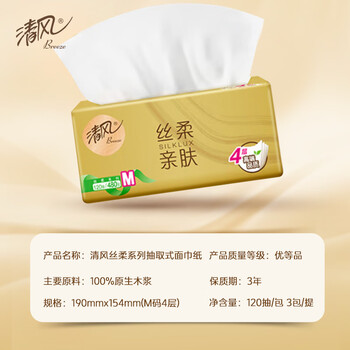 清风抽纸 丝柔4层120抽*3包M码 卫生纸巾纸抽 提装餐巾纸面巾纸